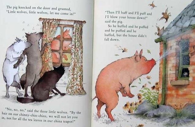 I thought this story was a clever spin on the classic tale that took a more modern twist. The author turns the tale on its head by making everything an opposite, including the effectiveness of the materials the wolves used to build their many homes to protect themselves from the Big Bad Pig.